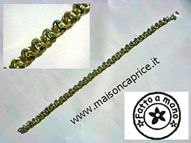 braccialetto unisex in maglia metallica fatto a mano, colore champagne e verde, L 19,5 cm, diam. 5,5 mm ca.